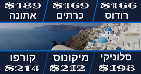 מתכננים עצמאית חופשה ביוון? הצעת היום: טיסות למגוון יעדים ביוון בחודש יוני: רודוס 166 דולר; כרתים 169 דולר; אתונה 189 דולר; סלוניקי 198 דולר; מיקונוס 212 דולר; קורפו 214 דולר.