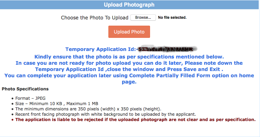 בסוף הדף תתבקשו לצרף תמונה של מבקש הויזה. לשם כך עליכם להכין מראש תמונת דיוקן שלכם, על רקע לבן בפורמט JPEG, בגודל מינימלי של 10KB ובגודל מקסימלי של 1MB, במידה מינימלית של 350 על 350 פיקסלים. כך ייראה הדף מתוכו תבחרו את התמונה (לרבות ההנחיות להכנת התמונה):