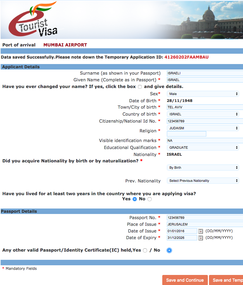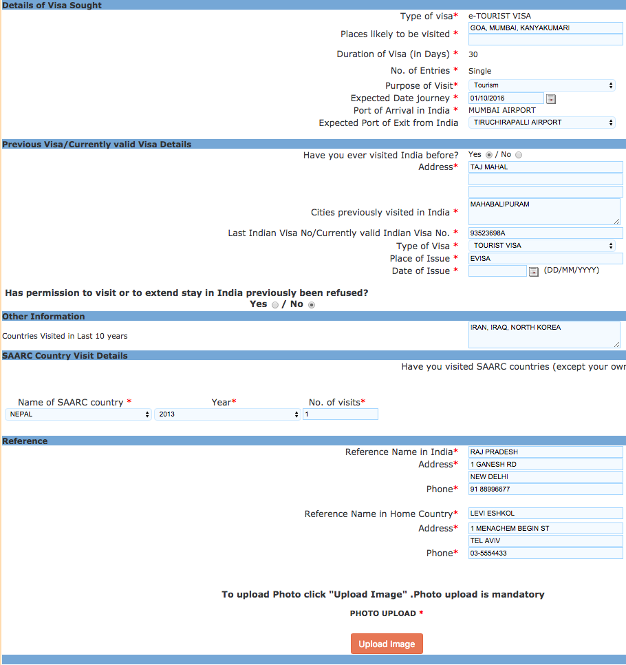 בעמוד הבא, תתבקשו לתת פרטים על מסלול הטיול שלכם, על ויזות קודמות להודו, אם היו לכם, וכן לספק מידע על אנשי קשר בהודו ובבית. אם אתם סובלים ממחסור באנשי קשר בהודו, הנסיון מלמד שתוכלו לציין (למשל) את שמו של פקיד המלון עמו התכתבתם לפני הנסיעה. לאחר המילוי, דף זה ייראה בערך כך: