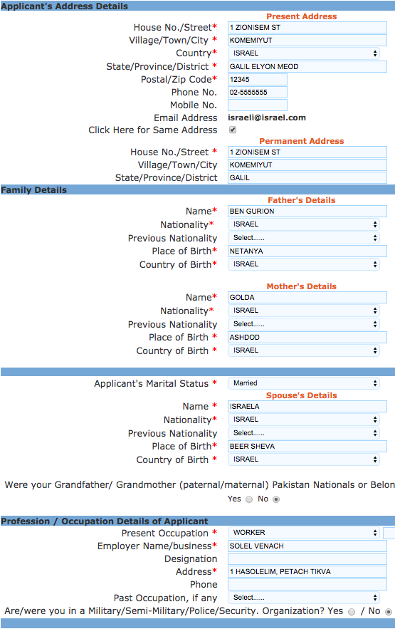 אם שרתתם בצה״ל (שלא כמו ידידנו ישראל ישראלי, מהטופס שלמעלה), ציינו ״כן״ בשאלה האחרונה, ואז פרטו את שם הצבא (IDF), תפקידכם, דרגתכם, ואת מקום השירות (יש לקוות שישראל). מהנסיון, שירות בצה״ל אינו מהווה מחסום בפני קבלת ויזה להודו.
