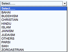 הצצה ראשונה למגוון האנושי ההודי ניתן לקבל תחת סעיף דת (religion), שבו מוצעות שפע של אפשרויות, מזורואסטריות ועד ג׳ייניזם, עבור ביהדות, איסלם ונצרות. לא מצאתם? תוכלו לבחור בדת ״אחרת״ ולפרט בשורה הבאה.