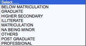 ממשלת הודו מעוניינת לקבל מידע גם על רמת החינוך של מבקשי הויזה. לא למדתם? לא נורא. אפשר לבחור גם באפשרות: אנאלפבתי (Illiterate). הבחירה הנכונה עבור ילדים היא: NA BEING MINOR.